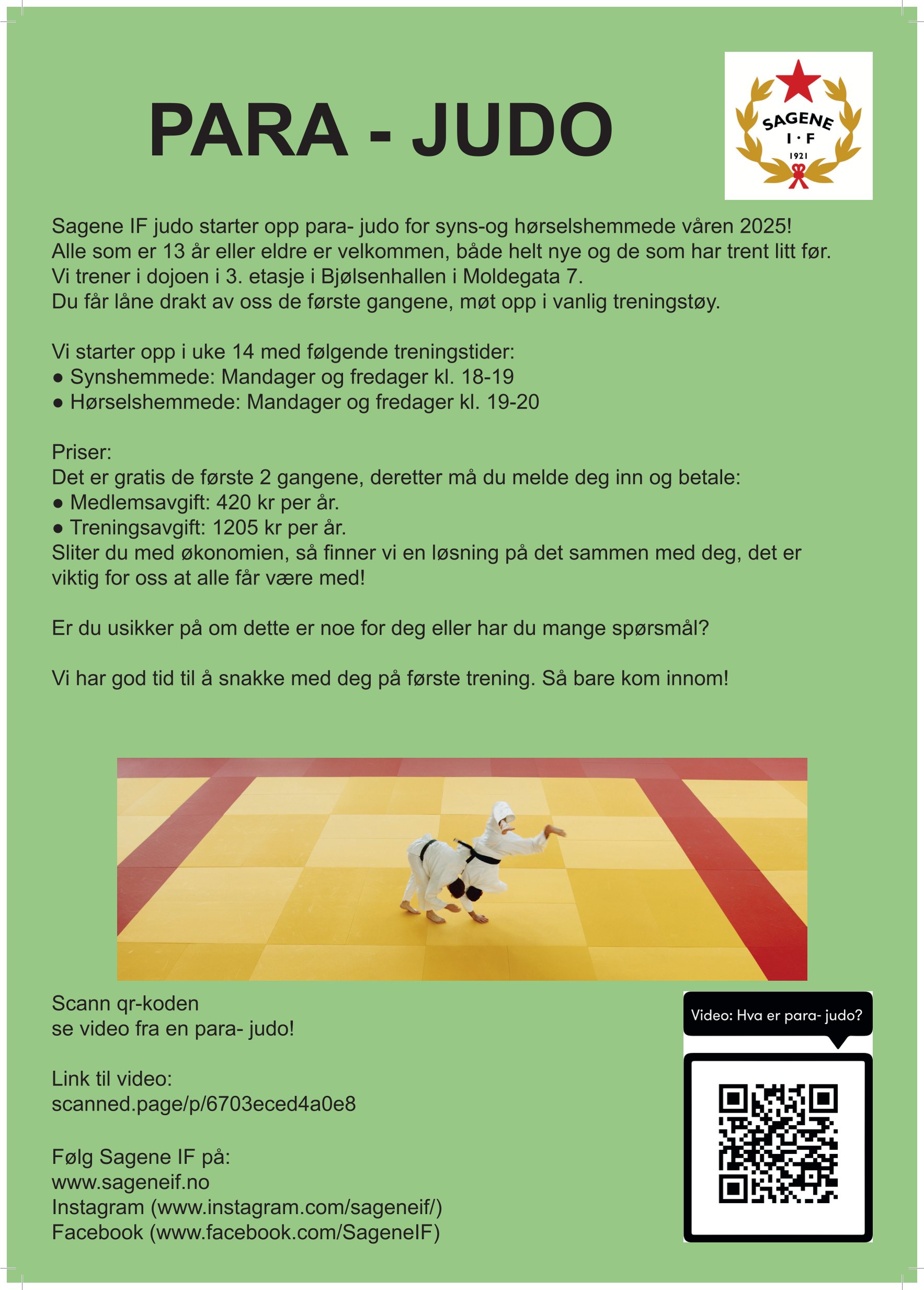 Sagene IF judo starter opp judo for syns-og hørselshemmede! Det blir en gruppe for synshemmede og en for hørselshemmede.Alle som er 13 år eller eldre er velkommen, både helt nye og de som har trent litt før. Vi trener i dojoen i 3. etasje i Bjølsenhallen i Moldegata 7. Du får låne drakt av oss de første gangene, møt opp i vanlig treningstøy. Les mer under.